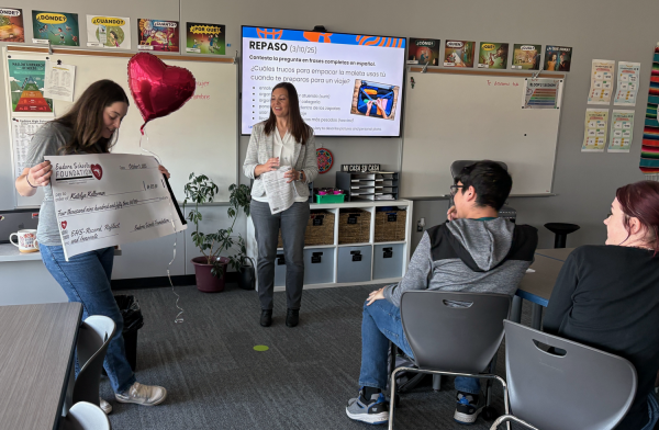 High school Spanish teacher Katelyn Kellerman received a $4,953 grant to supply teaching pathway students with iPads and Swivl robots. Her full class of Spanish students looked on as she accepted the grant.